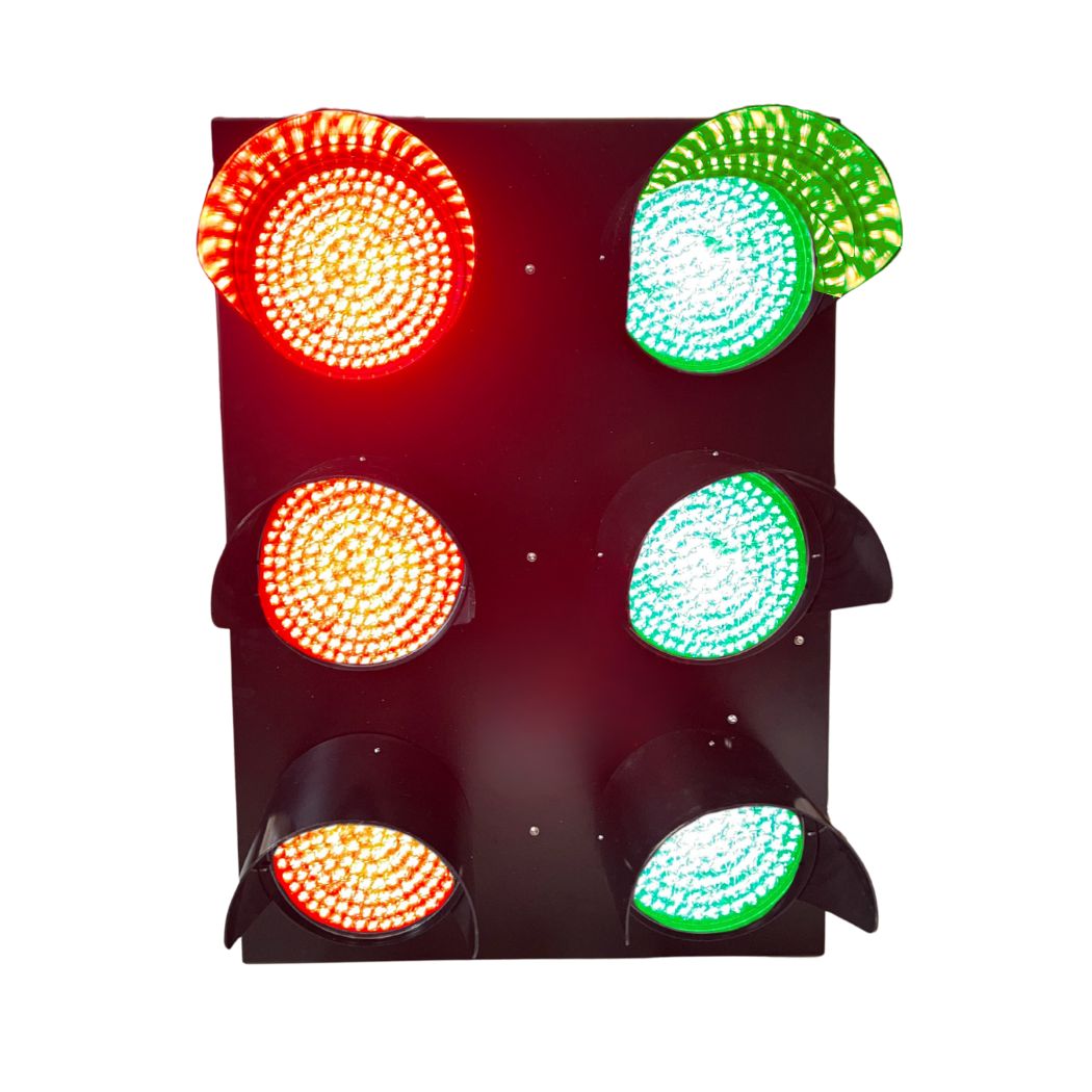 Sur cette tôle aluminium sont disposé 6 foyers leds de 300mm de diamètre : 3 feux rouges à gauche et 3 feux verts à droite. Chaque optique comprend des leds haute intensité pour un fort impact visuel.