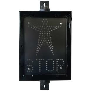 Le pictogramme piéton est allumé fixe et la mention STOP est clignotante. La durée d'extinction entre deux allumages successifs doit être de 6 secondes minimum.